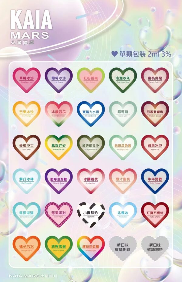 • 體驗前所未有的順滑口感與豐富選擇,【KAIA凱亞】火星凱亞一代煙彈適合追求極致風味的您。每顆煙彈容量為 2ml,含有 3%尼古丁濃度,專為提供理想的滿足感而設計。